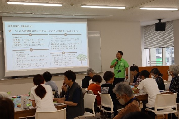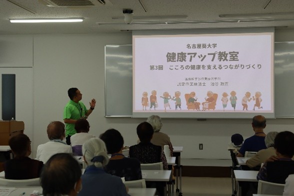 前半では、「こころの健康を支えるつながりづくり」と題して、作業療法学科の池谷政直助教より講義があり、高齢者うつの特徴やそのサインと対応等に加え、「こころの健康チェック」を通してご自身の状態を知るとともに、地域での社会的サポートの豊かさが大切だと認識していただくことができました。