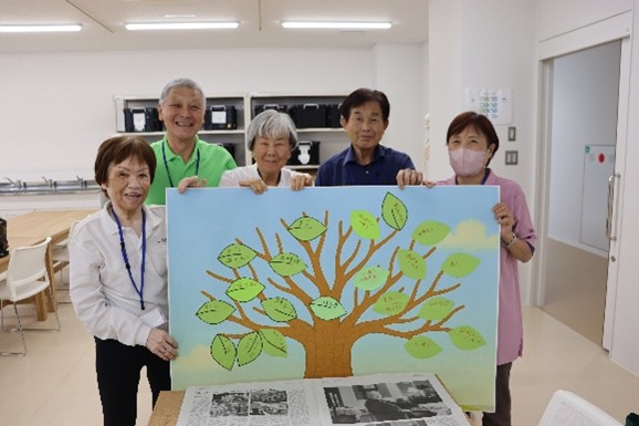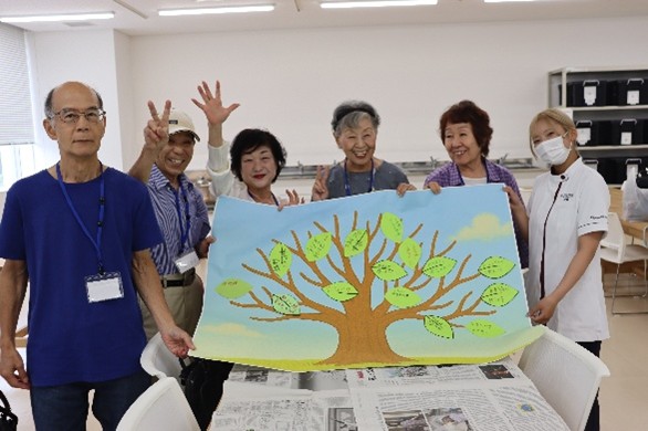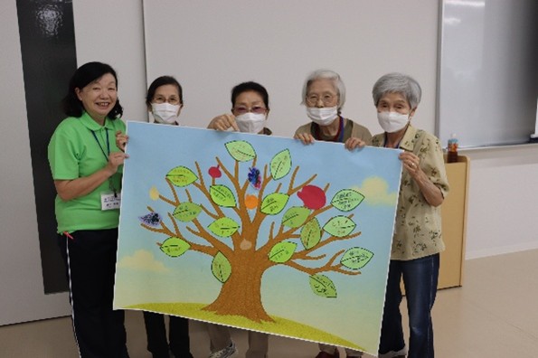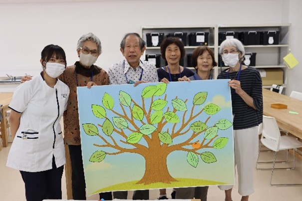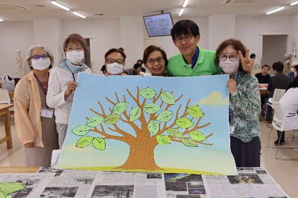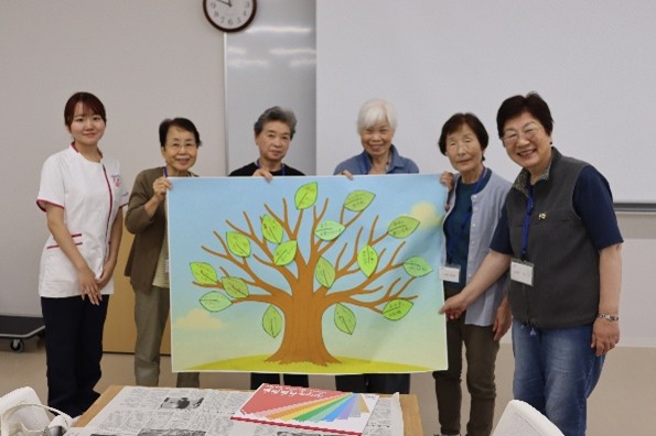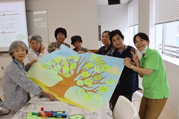 体操をはさんで後半は、8つのグループに分かれ、「こころの健康の木」を作成するというワークショップを行いました。グループのメンバーがそれぞれ、最近楽しかったことややってみたいこと、大切にしているもの等を、葉っぱに見立てた紙に書いて発表し、模造紙に描かれた木に貼っていきました。どのグループからも笑い声と拍手が聞こえ、お互いを知ることを通して一体感の生まれている様子が伺えました。