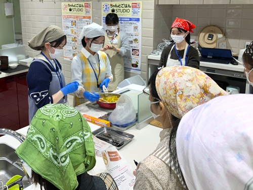 学生はデモンストレーションの30分間で減塩メニュー4品を作成し、その後、参加の皆様に30分間で同様に4品作成していただきました。