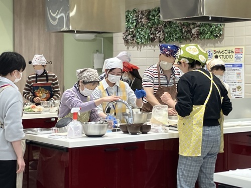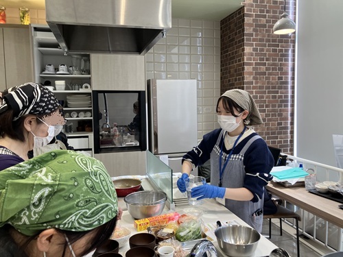 2月24日に、名古屋市健康増進課・イオン千種キッチンスタジオとのコラボ事業として減塩教室を開催し、本学の健康科学部 健康栄養学科3年生、舟橋麻由さん、堀尾菜々音さん、望月彩那さんの3名がレシピの考案から当日の説明、デモンストレーションまで担当しました。